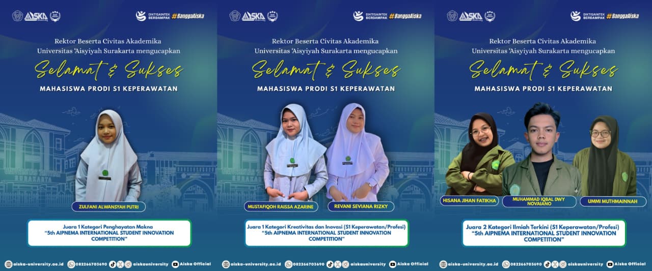 Surakarta — Prestasi membanggakan kembali ditorehkan oleh mahasiswa Program Studi S1 Keperawatan Universitas ’Aisyiyah Surakarta (Aiska University). Dalam ajang 5th AIPNEMA International Student Innovation Competition, para mahasiswa berhasil meraih sejumlah penghargaan bergengsi pada tingkat internasional.