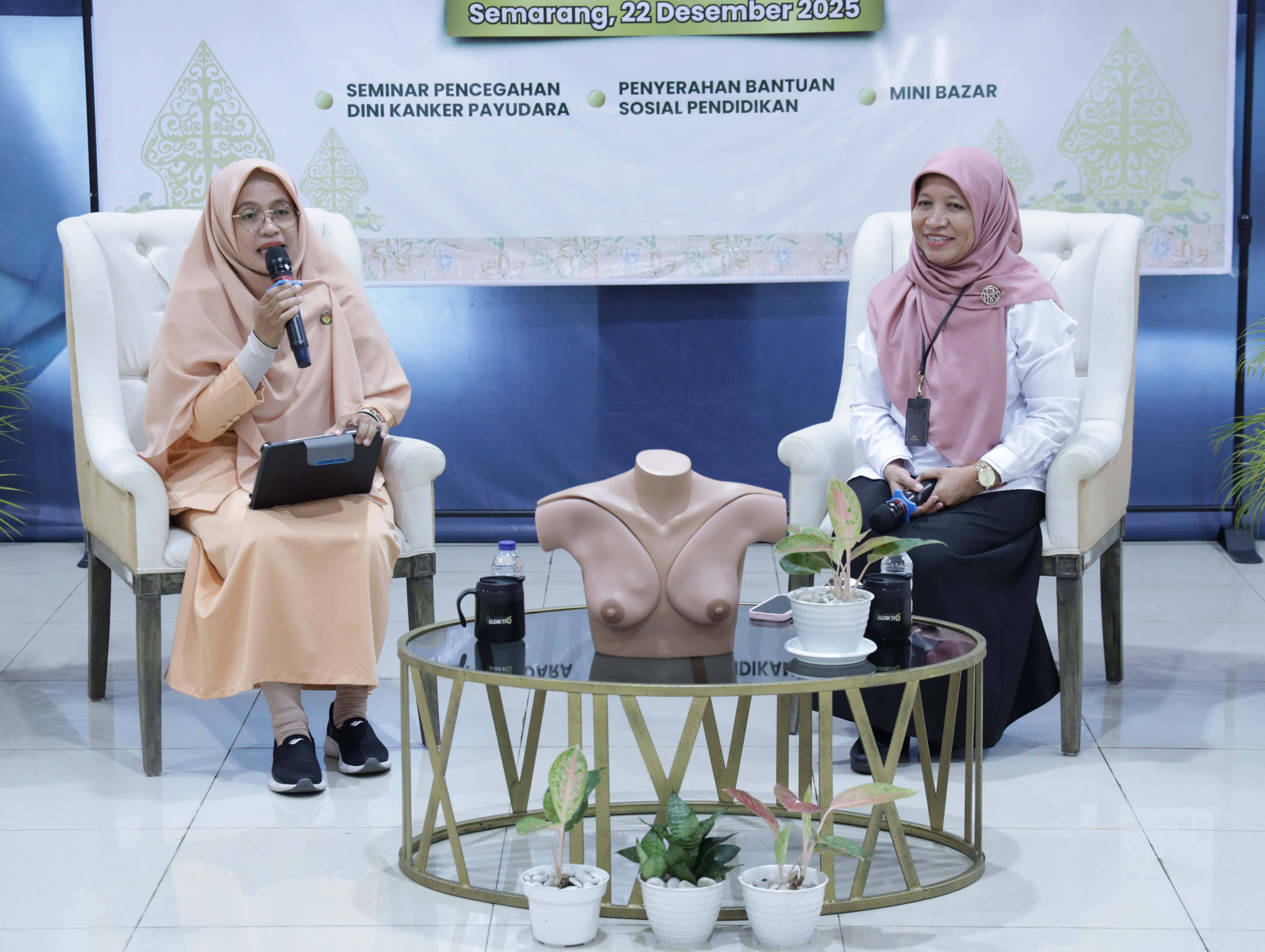 Salah satu agenda utama dalam peringatan ini adalah Seminar Pencegahan Dini Kanker Payudara (Breast Aware) yang disampaikan oleh Dr. Ns. Machmudah, M.Kep., Sp.Kep.Mat. dari Universitas Muhammadiyah Semarang, Dalam paparannya, Ns. Machmudah menjelaskan bahwa deteksi dini melalui SADARI (Pemeriksaan Payudara Sendiri) dan SADANIS (Pemeriksaan Payudara Klinis) merupakan langkah penting dalam upaya pencegahan kanker payudara. Pemeriksaan payudara sendiri dianjurkan dilakukan secara rutin satu kali setiap bulan agar perubahan pada payudara dapat dikenali lebih awal, sehingga penanganan medis dapat dilakukan secara cepat dan tepat.