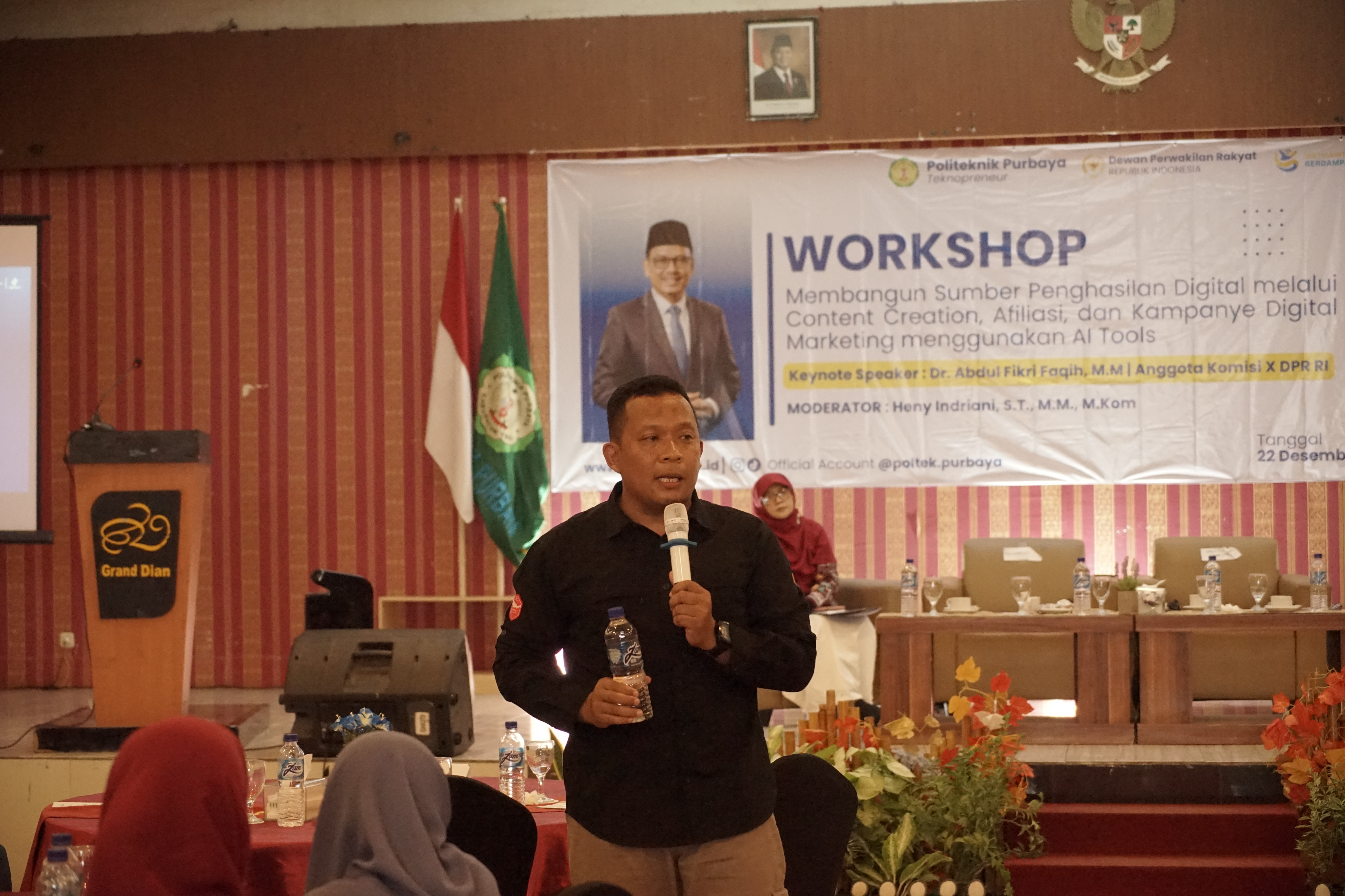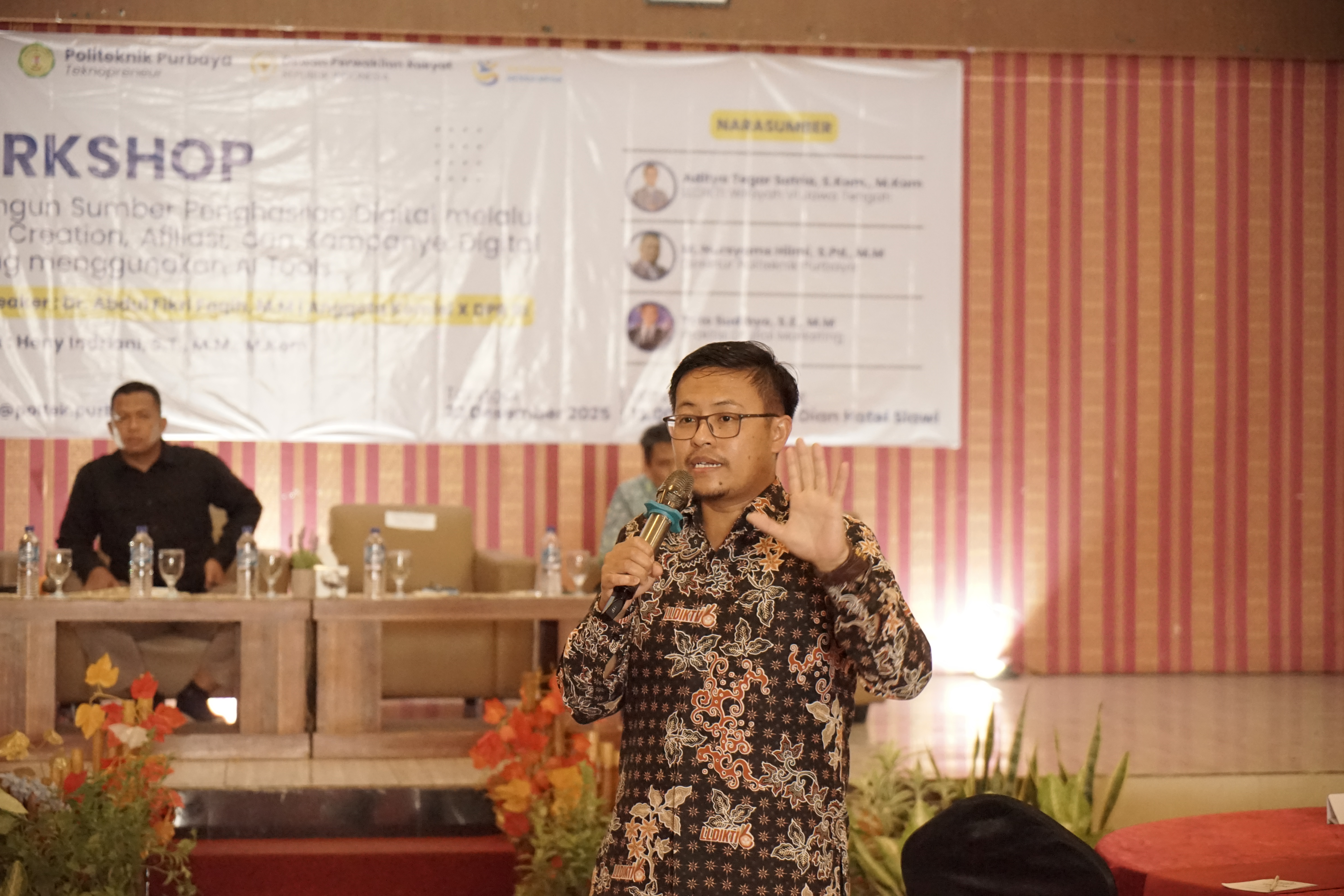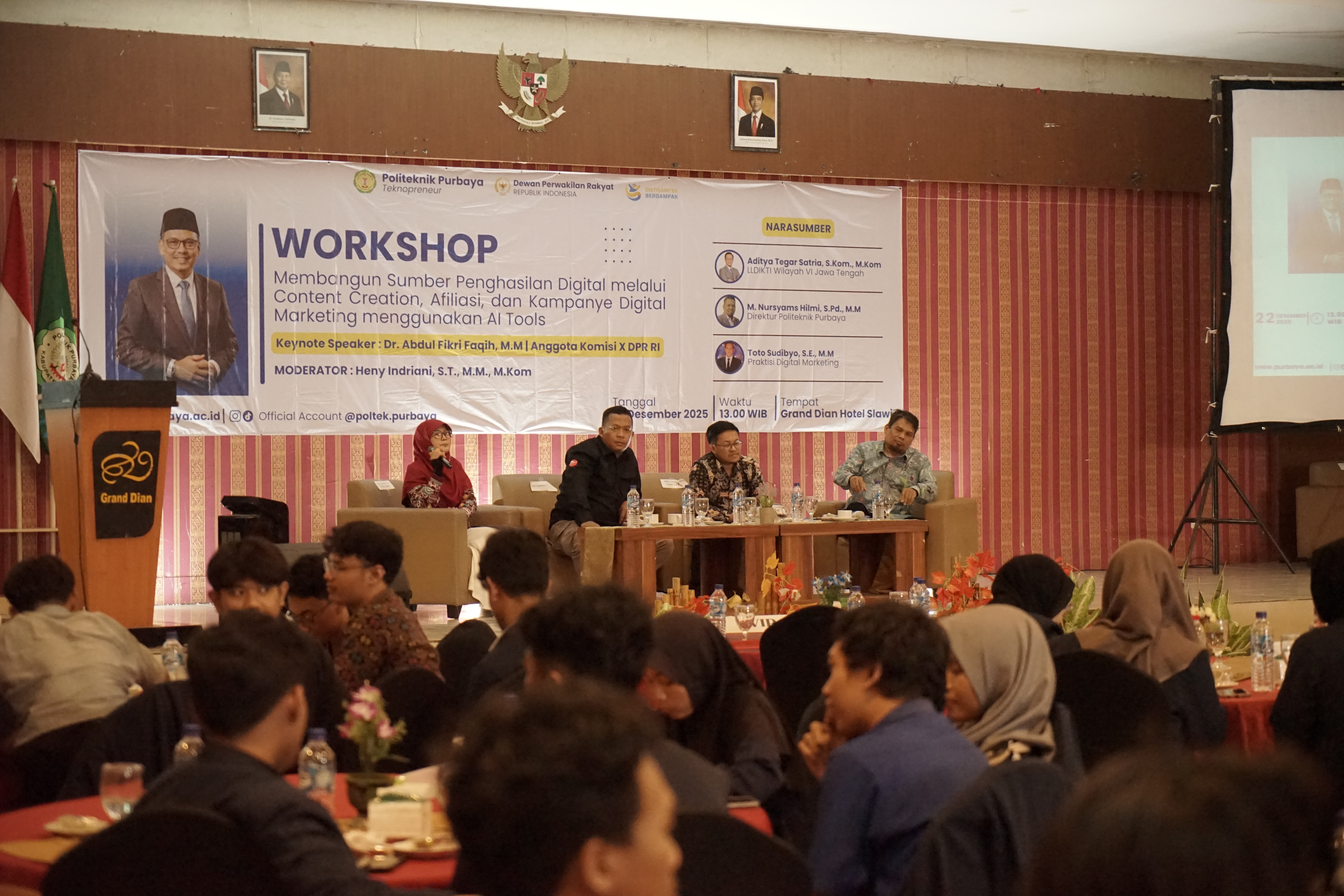 Kabupaten Tegal — Politeknik Purbaya Tegal bekerjasama dengan Komisi X DPR RI dan Kementerian Pendidikan Tinggi, Sains dan Teknologi (Kemdiktisaintek) menyelenggarakan Workshop Digital pada Senin (22/12), sebagai upaya memperkuat relevansi pendidikan vokasi dengan kebutuhan industri dan perkembangan teknologi digital. Kegiatan yang diikuti oleh sekitar 100 mahasiswa Poltek Purbaya ini menekankan pentingnya pembelajaran berbasis skill, praktik, dan pemanfaatan teknologi digital guna menyiapkan lulusan yang siap kerja dan siap bersaing di era digital.
