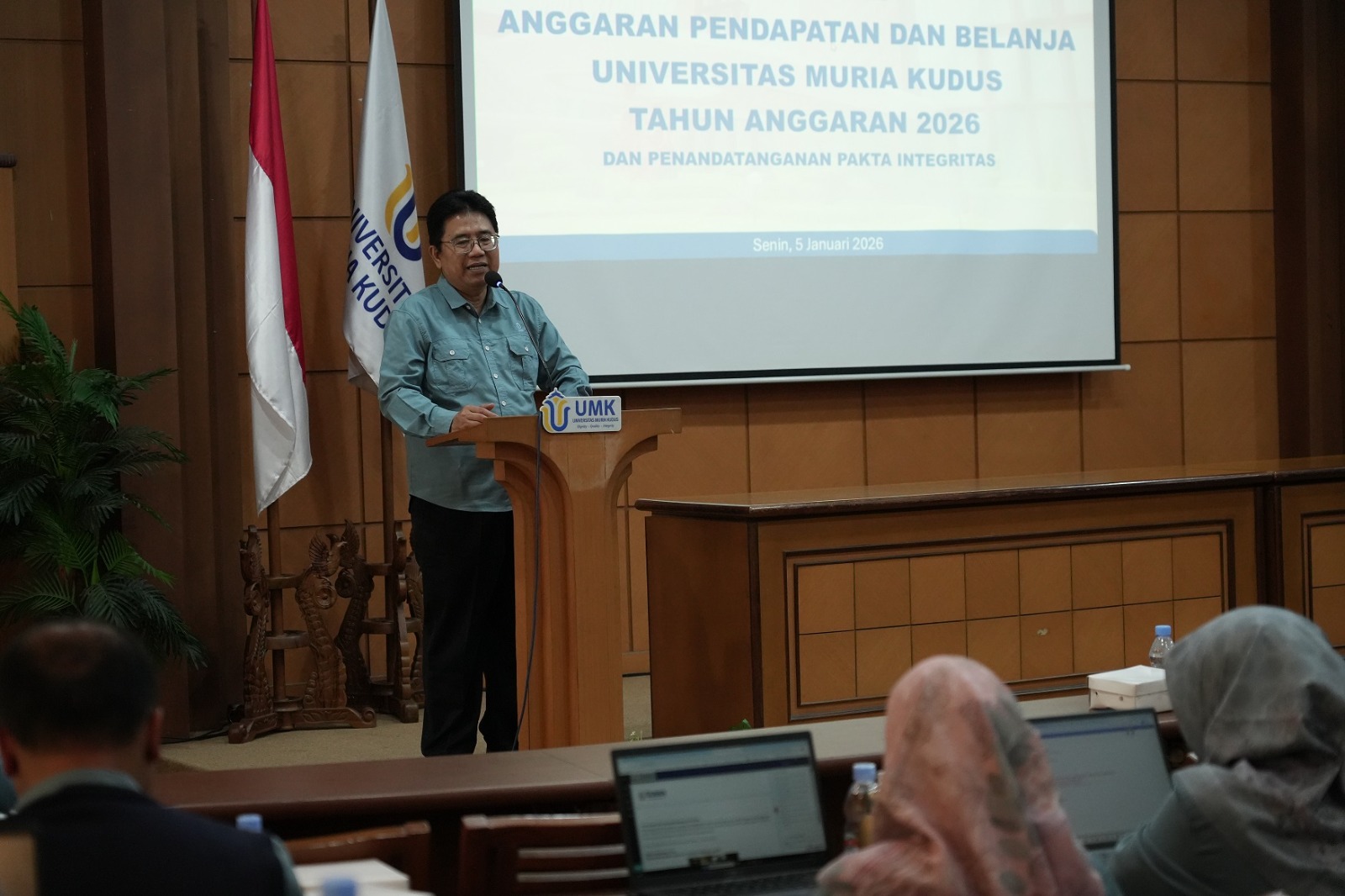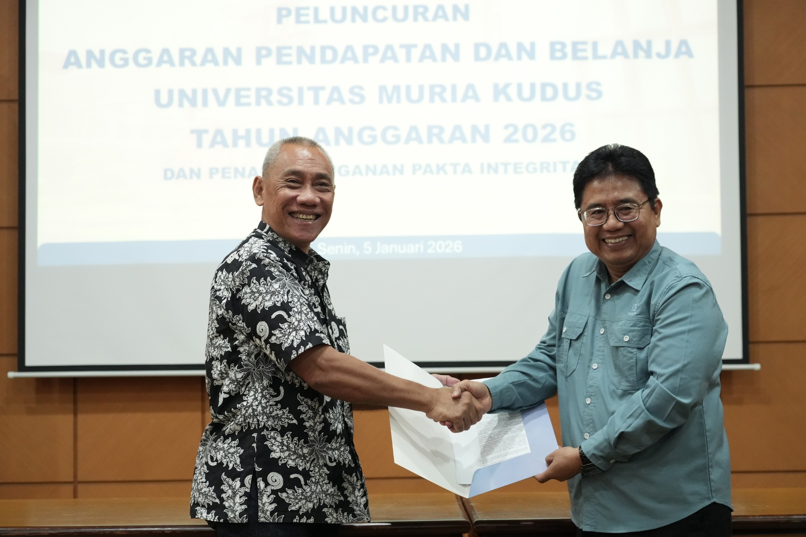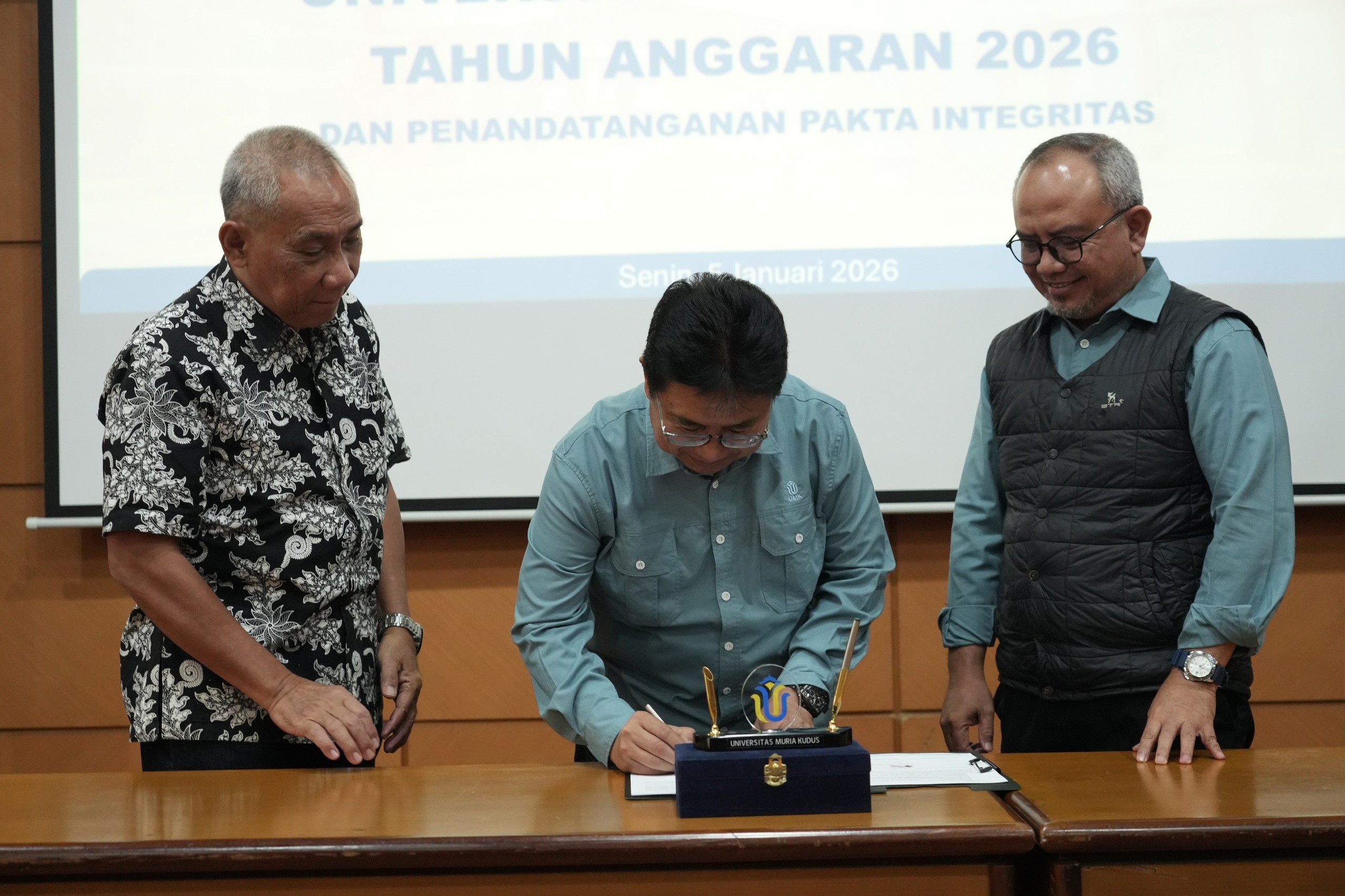 UMK — Universitas Muria Kudus (UMK) secara resmi melaksanakan Peluncuran Anggaran Pendapatan dan Belanja Universitas (APBU) Tahun Anggaran 2026 yang dirangkai dengan penandatanganan Pakta Integritas, Senin (5/1/2026). Kegiatan ini menjadi langkah strategis dalam memperkuat tata kelola keuangan universitas agar berjalan sesuai dengan prinsip governance sebagai bagian dari penguatan Universitas Muria Kudus yang unggul.