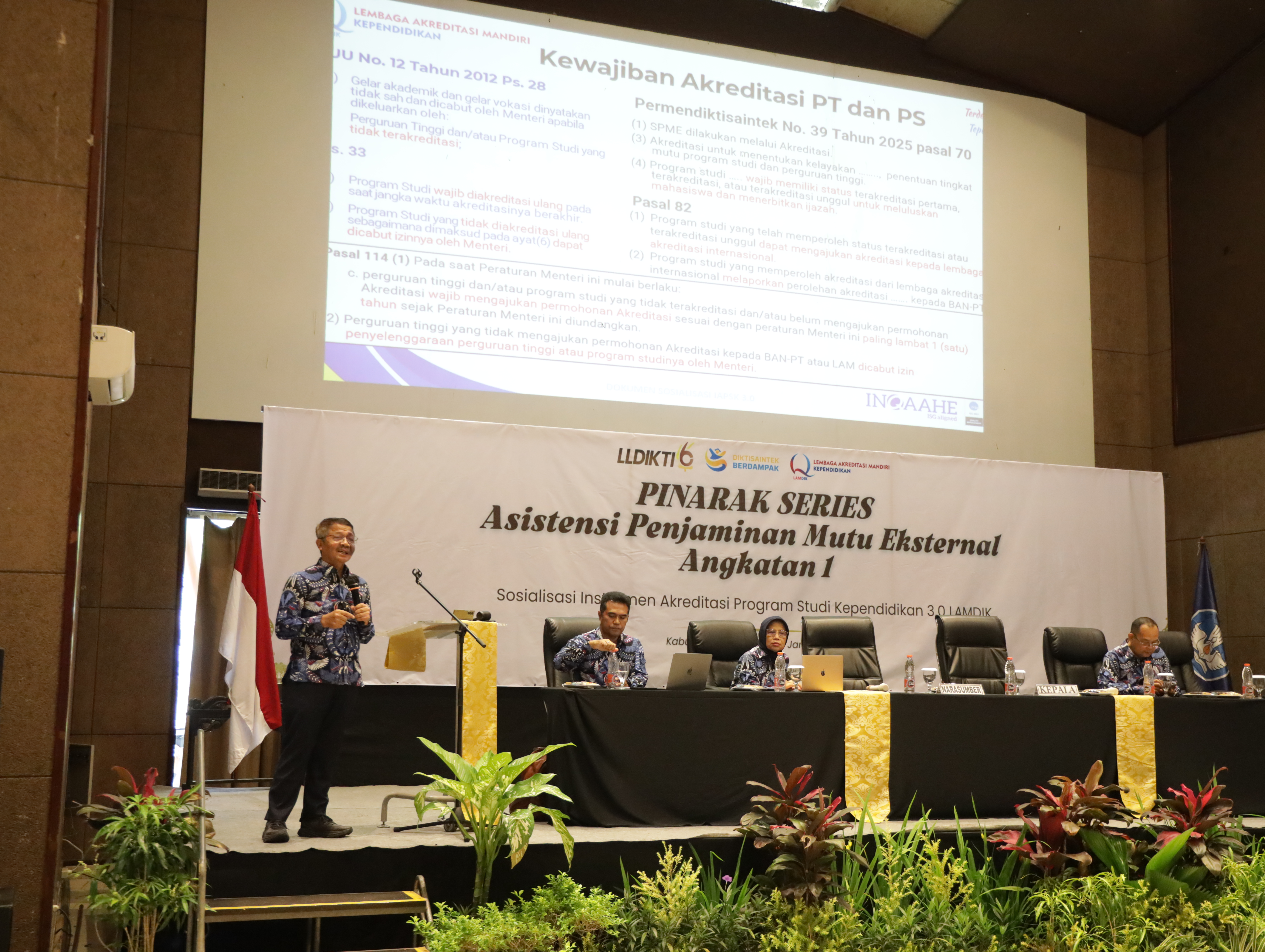 Dalam kegiatan tersebut, Prof. Dr. Sutrisna Wibawa, M.Pd. hadir bersama jajaran LAMDIK yang menyampaikan kebijakan dan materi teknis terkait Instrumen Akreditasi Program Studi Kependidikan (IAPSK) 3.0 sebagai implementasi Permendiktisaintek Nomor 39 Tahun 2025. Materi yang disampaikan mencakup kerangka IAPSK 3.0, penyusunan LED dan DKPS versi 3.0, kriteria dan mekanisme penilaian akreditasi, serta pengenalan SIMALAMDIK 3.0. Paparan tersebut disampaikan oleh: